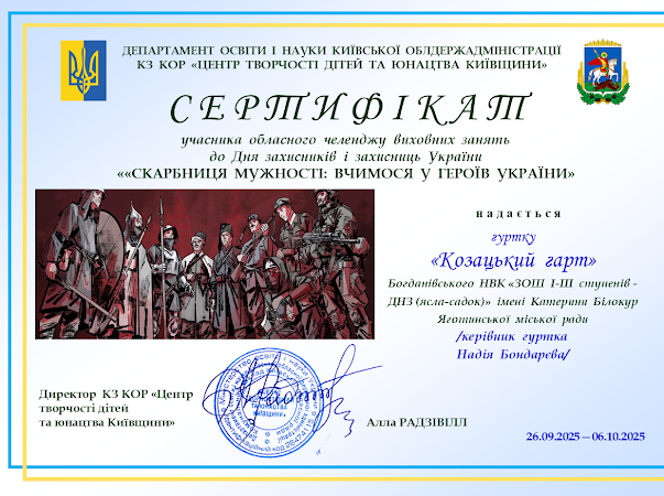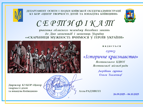 У період з 26 вересня по 6 жовтня 2025 року у гуртках закладів освіти Київщини відбувся обласний челендж виховних занять до Дня захисників і захисниць України “Скарбниця мужності: вчимося у Героїв України”, організований відділом спортивного туризму та краєзнавства КЗ КОР «Центр творчості дітей та юнацтва Київщини». Захід мав на меті вшанування подвигу захисників України, виховання патріотизму серед учнівської молоді та поширення ефективних форм виховної роботи серед педагогів області.